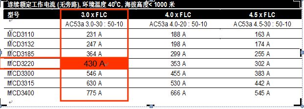 當(dāng)起動電流倍數(shù)為3倍時,額定電機(jī)滿載電流430A,由此推算其額定輸出電流能力為: