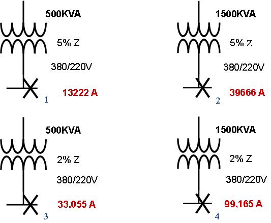 Z為電網(wǎng)(變壓器加上電纜)內(nèi)阻。圖二以電網(wǎng)內(nèi)阻為5%和2%為例,分別計算出Isca的值。
