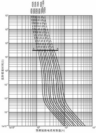 弧前時間具體值可從圖五查得??梢圆榈筋~定電流800A的快速熔斷器,當(dāng)短路電流為13222A時,弧前時間<2mS;當(dāng)短路電流為99165A時,弧前時間< 0.1mS。