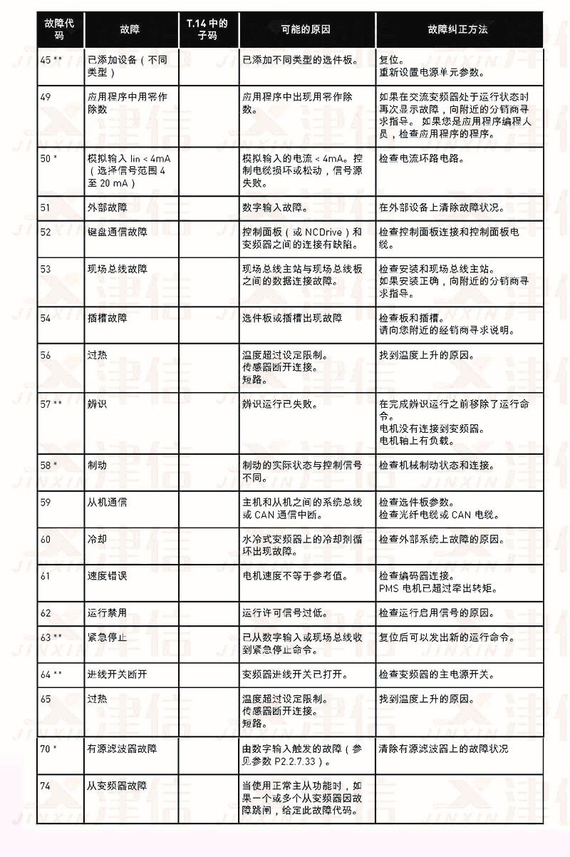 五、偉肯NX變頻器故障代碼FT45,49,50,51,52,53,54,55,56,57,58,59,60,61,62,63,64,65,70,74