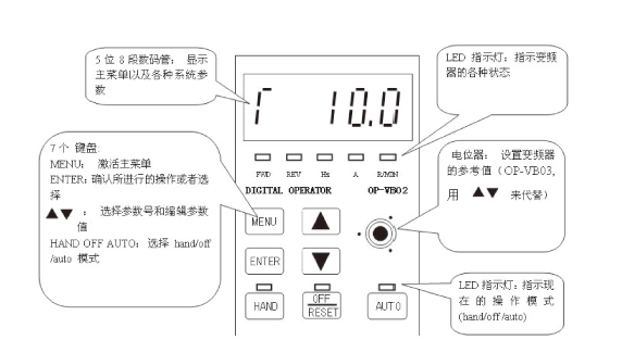 海利普變頻器的參數(shù)通過(guò)面板來(lái)進(jìn)行設(shè)置。面板和使用步驟如下圖: