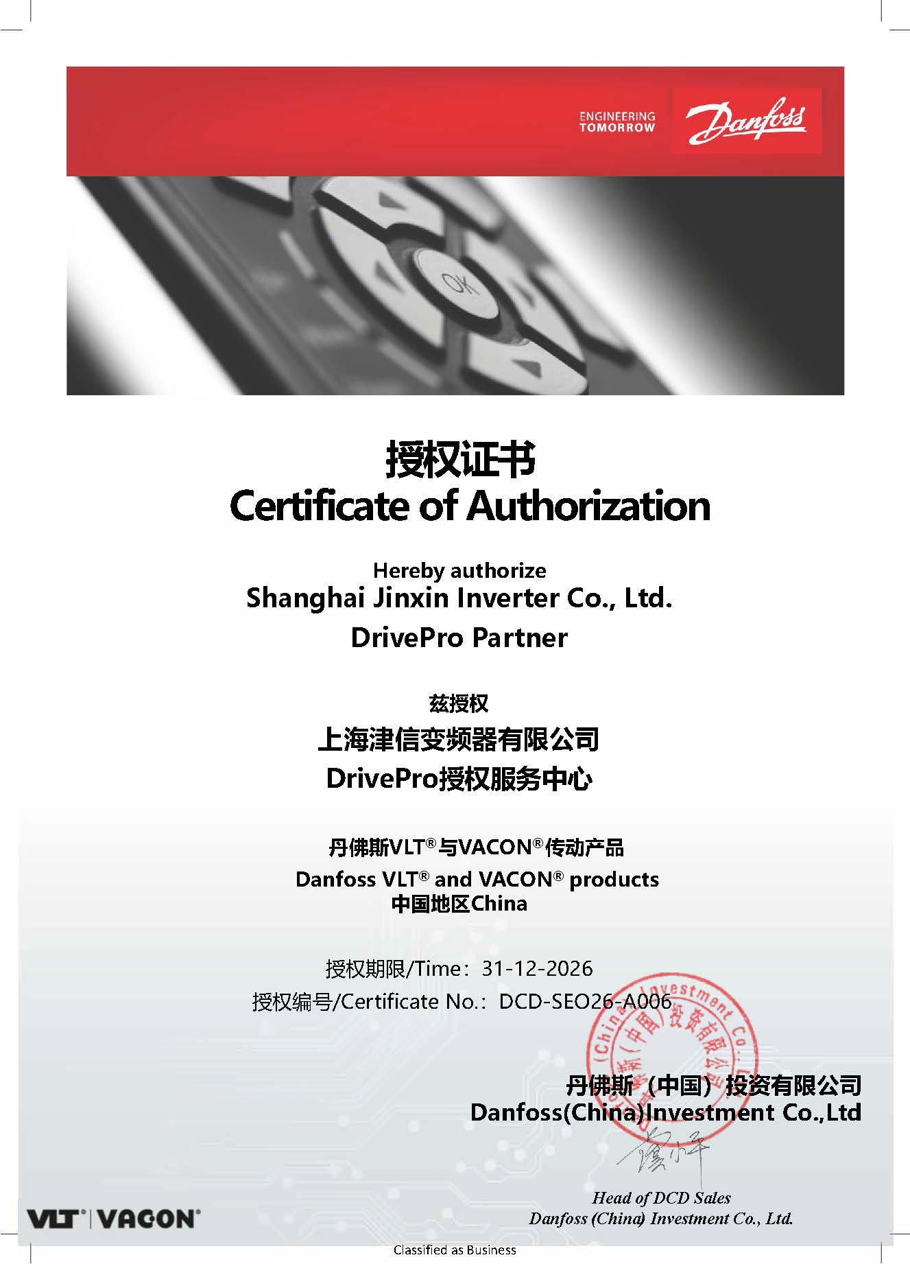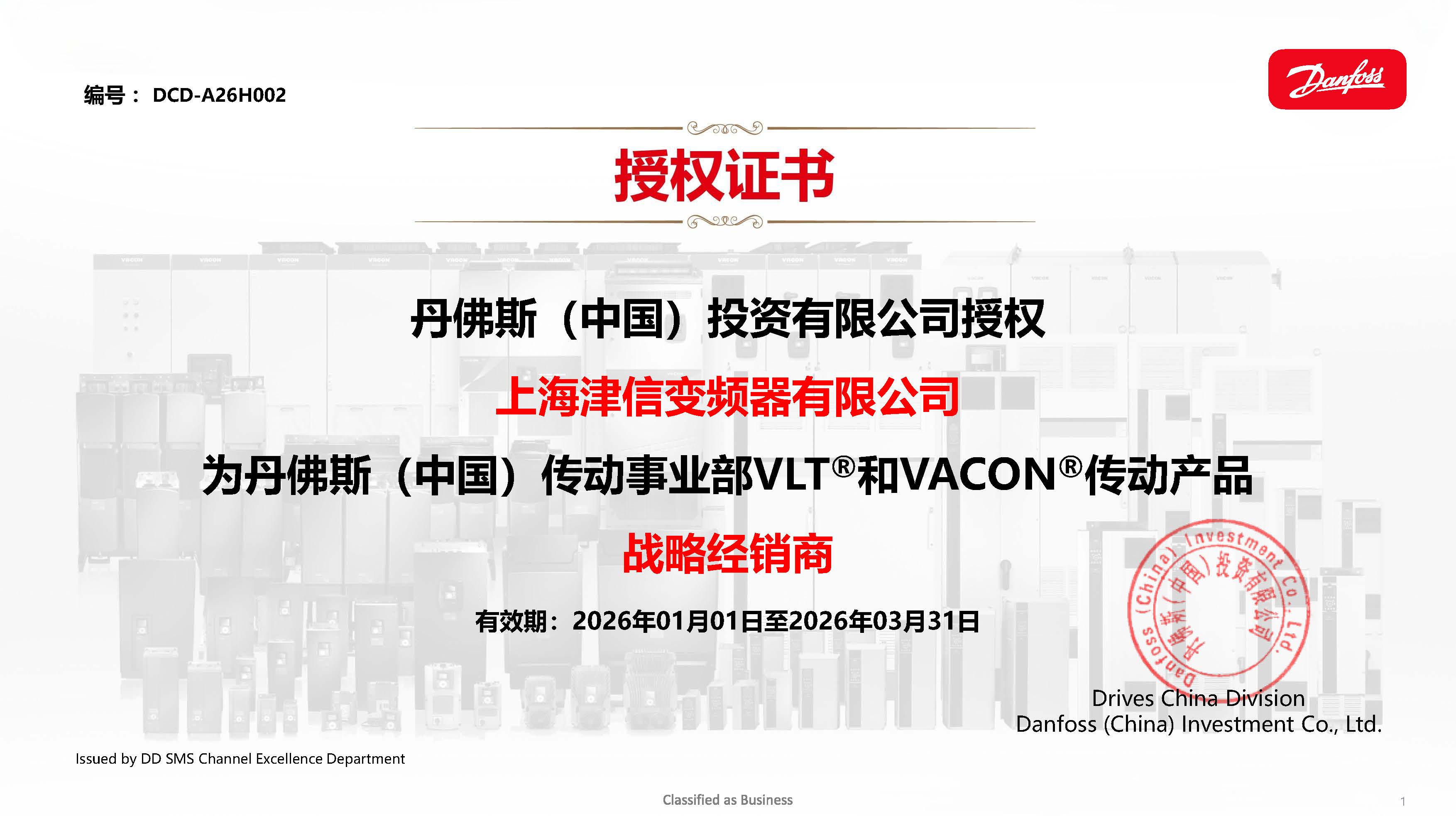 丹佛斯戰略經銷商證書