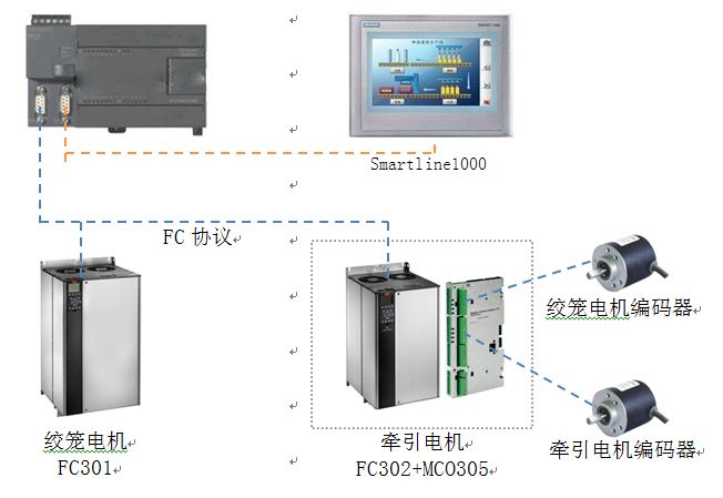 PLC的PORT1口與兩臺變頻器在一個總線上,采用FC協(xié)議進(jìn)行通信;PORT0則連接西門子的人機(jī)屏。其中牽引電機(jī)變頻器FC302上,安裝MCO305選件卡,同時將兩個電機(jī)的編碼器都接到MCO305上。由絞籠電機(jī)作為主軸,牽引電機(jī)作為從軸與主軸同步運動。