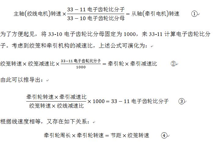 其中,絞籠轉(zhuǎn)速、節(jié)距由操作者給出,牽引輪周長、牽引減速比和絞線減速比取決于機(jī)械結(jié)構(gòu),由以上公式④推導(dǎo)出牽引輪轉(zhuǎn)速并帶入公式③,即可求出電子齒輪比分子,在計算的過程中須保證單位統(tǒng)一,計算出的電子齒輪比分子轉(zhuǎn)化為整數(shù)并通過FC協(xié)議寫入FC302的33-11參數(shù)。