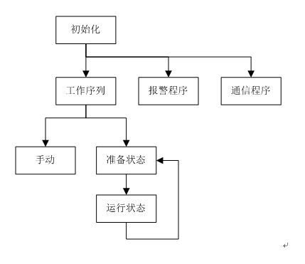 開機(jī)后,首先進(jìn)行通信和狀態(tài)的初始化。初始化完成后同時調(diào)用工作序列、報警和通信子程序。工作序列中,包含手動和自動兩種狀態(tài),自動運行又包括機(jī)組準(zhǔn)備(包括:松開機(jī)械抱閘、關(guān)閉防護(hù)門等動作)和機(jī)器運行兩個狀態(tài)。報警程序用于對機(jī)器狀態(tài)進(jìn)行實時監(jiān)控,并根據(jù)故障情況執(zhí)行相關(guān)動作。通信程序用于PLC和變頻器的FC協(xié)議通信。