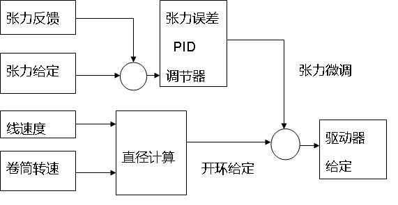 由于采用以上技術方案,使得排線平整,進而使收線伺服的控制是典型的中心卷繞控制。中心卷繞控制原理框圖如圖3所示。根據(jù)收線伺服當前實際轉速計算需要的開環(huán)給定量,同時通過跳舞輪反饋引入張力調節(jié),最終確定收線伺服驅動器的給定量。