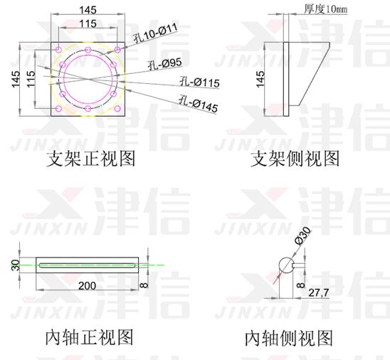 安裝OGD需要按現(xiàn)場條件準(zhǔn)備輔助支架和轉(zhuǎn)動(dòng)軸,這些附件的機(jī)械尺寸如下圖: