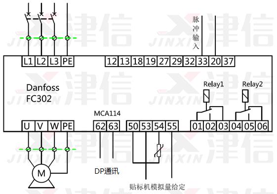 某飲料包裝線的套標(biāo)機(jī)傳輸皮帶使用兩臺(tái)同步電機(jī)作傳動(dòng)電機(jī),用一臺(tái)Danfoss VLT5000變頻器內(nèi)置Profibus-DP通訊卡,同時(shí)驅(qū)動(dòng)兩臺(tái)同步電機(jī)。由于電機(jī)已經(jīng)使用多年,需要更換。但是原電機(jī)采購成本較高,供貨時(shí)間也較長,因此上海津信選擇如下解決方案: