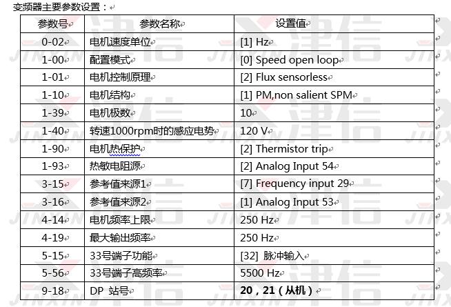 另一臺(tái)變頻器做從機(jī),采用丹佛斯特有的脈沖主從控制方式,跟隨主機(jī)輸出。實(shí)踐證明此種控制方式生立,兩臺(tái)電機(jī)轉(zhuǎn)速同步性非常好,轉(zhuǎn)速只有很小的誤差。唯一的缺點(diǎn)是從機(jī)的報(bào)警狀態(tài)無法被系統(tǒng)檢測到。