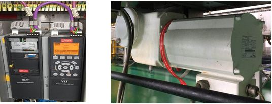 用兩臺(tái)Danfoss OGD電機(jī)替換原SSB Duradrive同步電機(jī),用2臺(tái)FC302驅(qū)動(dòng)器內(nèi)置MCA114 Profibus-DP通訊卡驅(qū)動(dòng)兩臺(tái)OGD電機(jī),替換原系統(tǒng)的VLT5000變頻器。