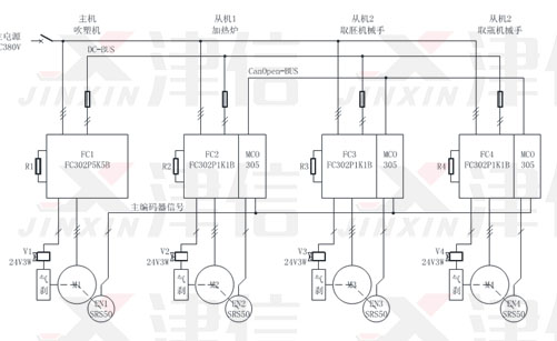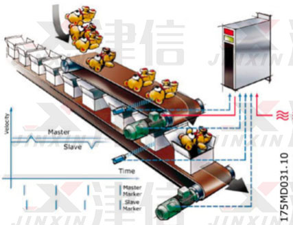 丹佛斯FC300高性能驅動器加上新一代MCO305高速運動專用控制器,可實現定位控制功能。電機可以選用異步或同步伺服電機。支持各種各樣的電機反饋裝置,從增量編碼器、絕對位置編碼器一直到旋轉變壓器。針對丹佛斯MCO305同步控制功能,上海津信變頻器有限公司為客戶在食品飲料行業吹瓶機上進行了技術應用。