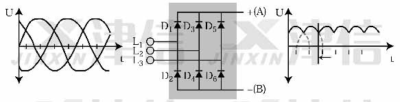圖1是變頻器整流部分的結(jié)構(gòu)及工作原理圖。變頻器通過三相整流橋?qū)⑤斎雮?cè)的三相交流電壓整流為帶有六脈沖尖峰的直流電壓。原來每一相的反相半個(gè)周期電壓疊加在正相電壓之上,因此在直流電壓上產(chǎn)生了周期為1/6正弦周期的脈沖波紋。