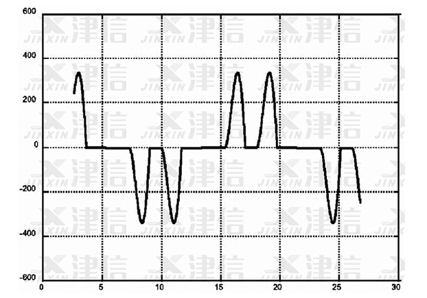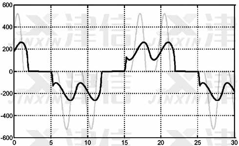圖3是在高壓示波器上測(cè)量出的輸入側(cè)電流波形圖,在此圖上可以清晰的看出變頻器輸入側(cè)電流波形所產(chǎn)生的畸變。