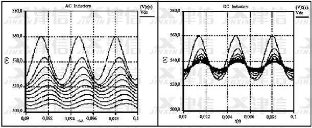 圖6中顯示的是加裝交流和直流電抗器對(duì)直流整流電壓的影響。從測(cè)量結(jié)果可以清晰看出加裝交流電抗器雖然對(duì)直流電壓上的高次諧波(520VDC以上)有明顯的抑制作用,但同時(shí)會(huì)造成直流側(cè)電壓的明顯損失。而直流電抗器在濾除高次諧波的同時(shí)對(duì)于直流電壓不會(huì)造成任何電壓損失