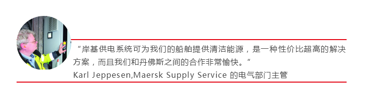 2017年初,Maersk Supply Service公司的電氣部門主管Karl Jeppesen針對公司管理提出了一個商業案例,即使用岸電為船舶供電,預計在6個月內實現投資回報。很快,公司就通過了這個岸電項目,而且到2017年10月時整套系統就已完全投入運行。