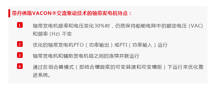 M/V Bore Sea上的軸帶發電機的主要原理。丹佛斯VACON®有源前端 (AFE) 單元和船舶電網上的LCL濾波器(以及專用軟件)一同構成了VACON® NXP電網變流器。