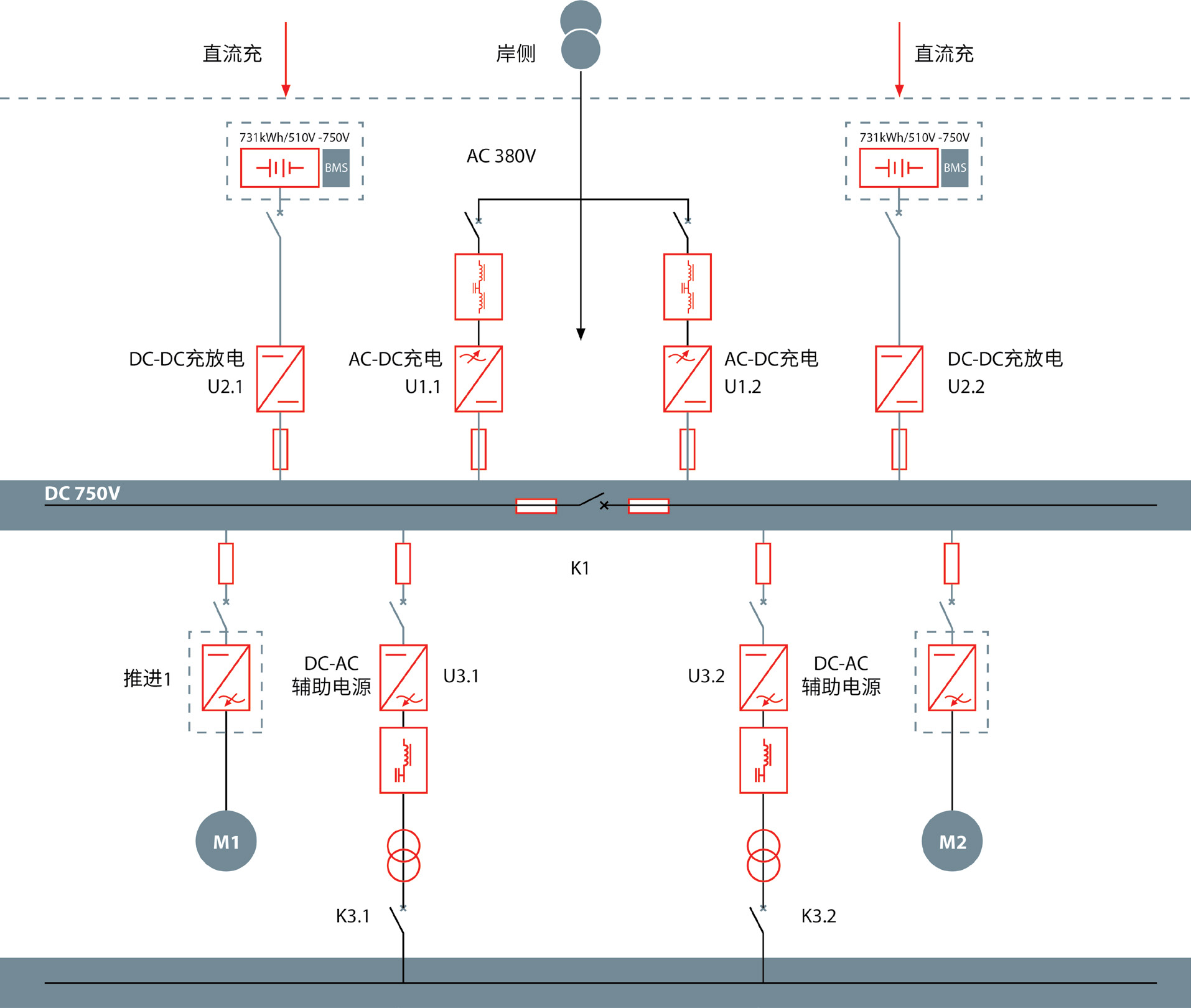 該船由中國最大的軌道交通電機電器生產企業-中國中車永濟電機有限公司整體研發制造,長江船舶設計院進行整船設計,整船在武昌船舶重工集團武昌基地制造并在各設備供應商配合下進行制造、調試和試航。由于該船設計立項為國內第一艘新能源純電動船,因此對整個系統的挑戰非常大,沒有任何可借鑒的經驗,因此對整船動力系統、舵槳系統、推進系統、配電系統、輔助系統及網絡通訊系統提出了非常高的要求;最值得一提是該項目中使用的是新型直流配電系統,更具有電能調節方便、節能提效、模塊化、智能化特點,諸多優勢使其成為船舶領域的新興技術;但相比于傳統的交流配電系統對該種配電方式也面臨諸多技術瓶頸。因此對變頻電源等核心元器件帶來巨大的挑戰,丹佛斯傳動憑借產品的優越的性能及穩定的質量打動了制造商及使用者,對動力系統、推進系統、配電系統及輔助系統進行了強有力的支持。